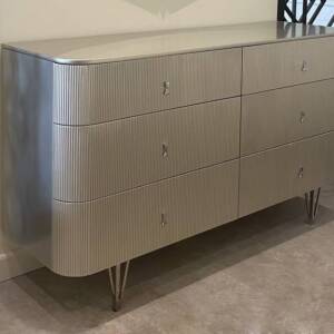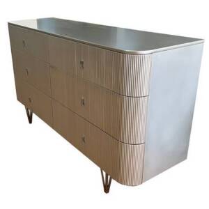 - تسريحة خشب بأدراج تتميز بتصميم أنيق وعصري باللون الفضي والشامبين الذي يضفي أناقة الي الغرفة.