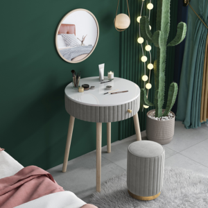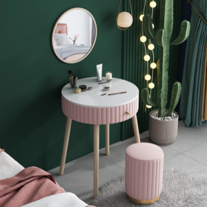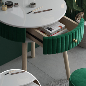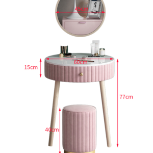 تسريحة مودرن صغيره تناسب ذوقك وتخل مكانك مرة مختلف ومفعم بالحيوية خصوصًا مع كونها مناسبة للمساحات المحدودة لتكون بمثابة لمسة مبهجة بغرفة نومك، تتميز بأجود أنواع الأخشاب بجانب كرسي منجد مخمل مع مراية.