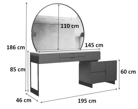 - تسريحة غرفة نوم: الارتفاع 186 سم، العمق 46 سم، العرض 145 سم.