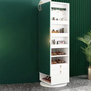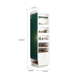 تتميز خزانة الأحذية بأرفف مميزة مع خاصية الدوران بتصميم مودرن . وتتميز بلمسة نهائية محايدة تنسق مع أي ديكور تقريبًا ، كما أن الوحدة مصنوعة من الخشب الام دي اف والقاعدة الصلبة الخشبية لتكمل البنية القوية إلى جانب تصميم ممتع.