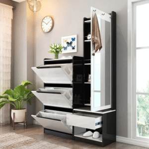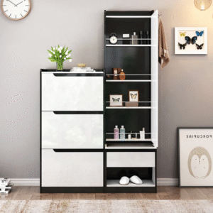 تتميز الخزانة بدولاب بمرأة وادراج بتصميم شيك يعمل بشكل ممتاز . وتتميز بلمسة نهائية محايدة تنسق مع أي ديكور تقريبًا ، كما أن الخزينة مصنوعة من الزجاج والخشب الام دي اف والقاعدة الخشبية الصلبة يمنحها بنية متينة إلى جانب تصميم ممتع.