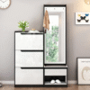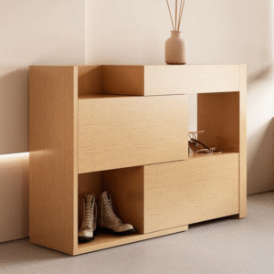 تتميز وحدة تخزين الاحذية بسطح مفتوح وادرج بتصميم مميز . وتتميز بلمسة نهائية محايدة تنسق مع أي ديكور تقريبًا ، كما أن سطح الوحدة المصنوع من الخشب الزان والقاعدة الصلبة الخشبية لتكمل البنية القوية إلى جانب تصميم ممتع.