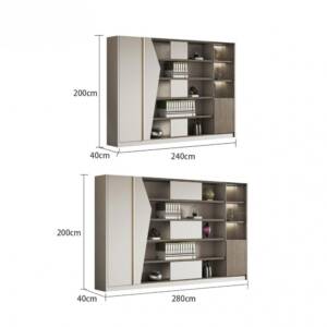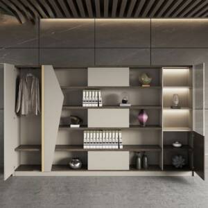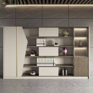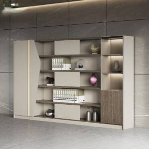 خزانة مكتبية مودرن تأتي بتصميم عصري يجمع بين الأناقة والعملية حيث ألوانها المحايدة التي تتناسب مع مختلف الديكورات، وتتكون الخزانة من عدة أقسام تشمل رفوف مفتوحة لعرض الكتب أو المستندات وأدراج مغلقة لوضع المقتنياتك الشخصية بعيدًا عن الأنظار وبعض أرففها زجاجية مضيئة بإضاءة LED لتضيف لمسة راقية في هيكل الخزانة المتين مما يضمن لك ثبات وقوة تحمل عالية وفخامة.