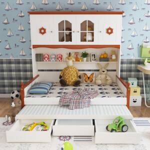 - يتميز سرير أطفال متعدد الوظائف أنه يحتوي على خزائن علوية مزودة بأبواب لحفظ الألعاب إلى جانب أدراج سفلية واسعة لتنظيم الغرفة.