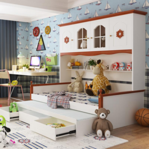 - يتميز سرير أطفال متعدد الوظائف بخزانة ومكتبة أنه بعد حل ذكي ومثالي للغرف ذات المساحة الصغيرة حيث يمكن استغلاله لتخزين كل ما يحتاجه الطفل دون الحاجة إلى خزانة إضافية.