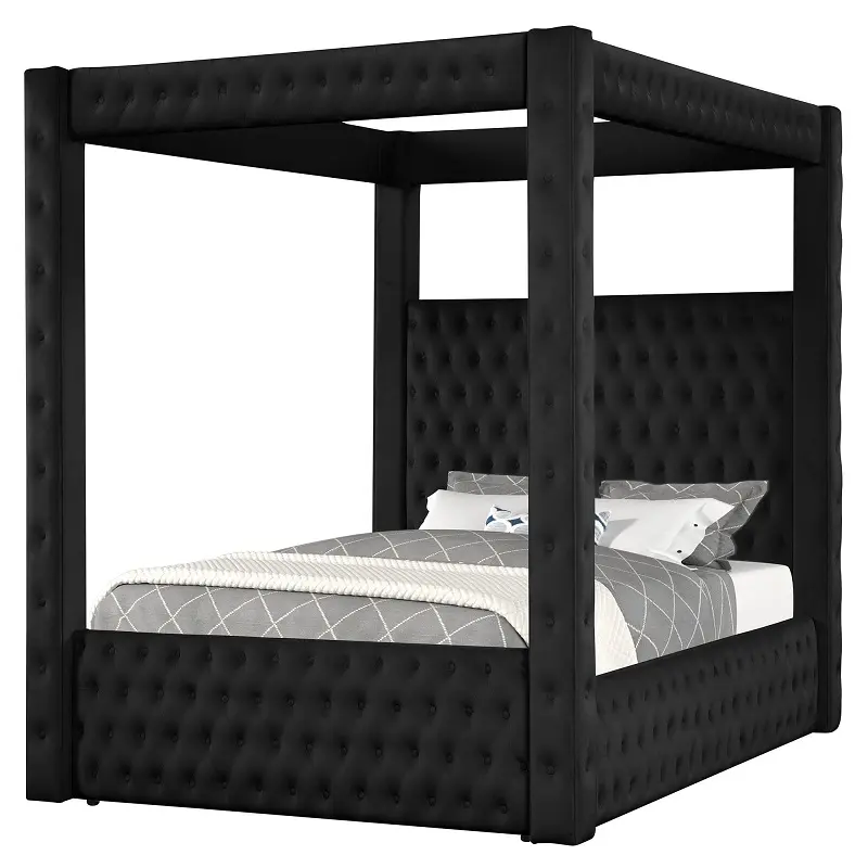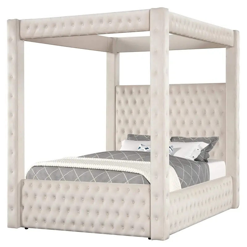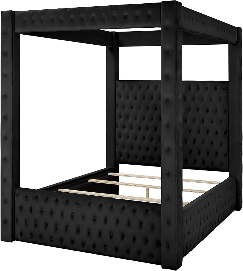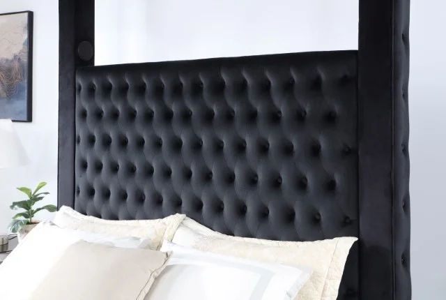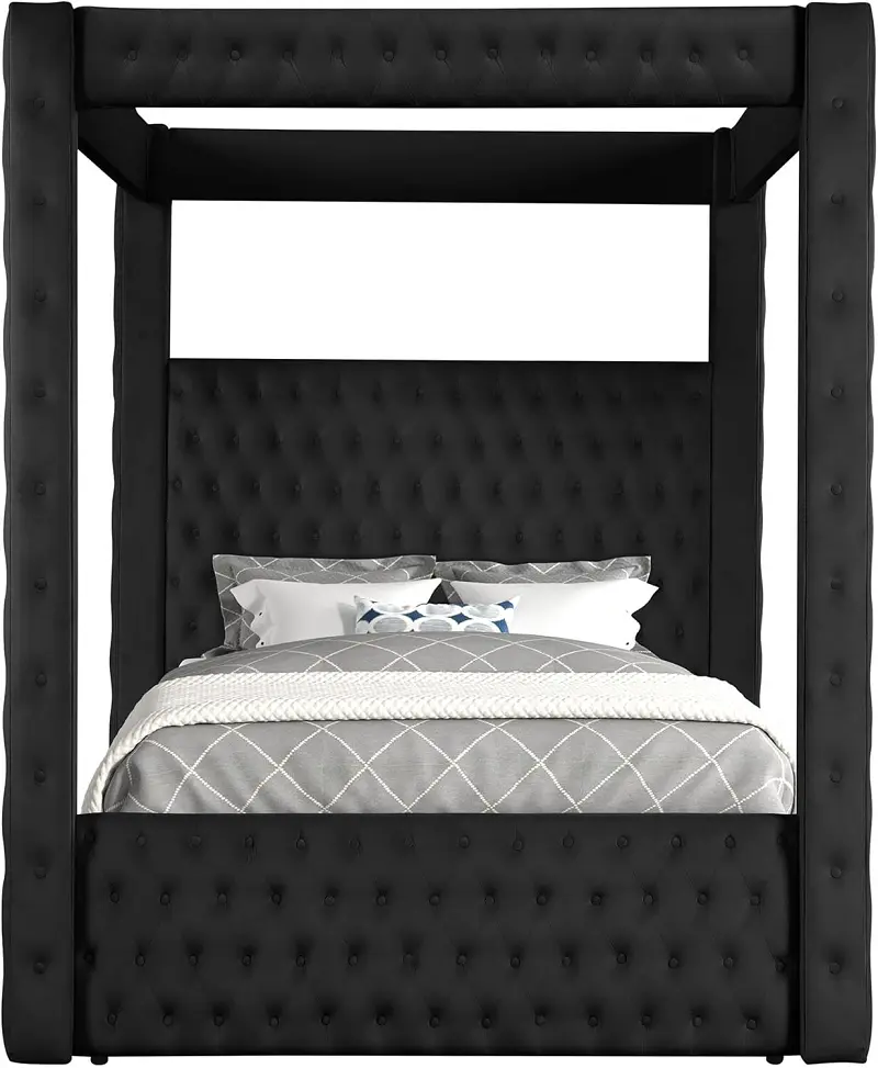 أكثر ما يميّز هذا السرير هو حضور “القلعة” الواضح: أعمدة مع سقف مفتوح يضيف طابعًا ملكيًا بشكل متوازن، مناسب للديكورات العصرية وكذلك الكلاسيكية. السقف المفتوح يحافظ على خفة الشكل العام ويجعل السرير نقطة تركيز أنيقة دون مبالغة، كما يمنحك مساحة لتنسيق الإضاءة أو الستائر الخفيفة حسب ذوقك.
