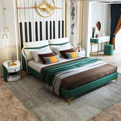 مواد فائقة الجودة: صُمم الهيكل من الخشب الهندسي وخشب الزان الروماني، مما يضمن المتانة والاستدامة على المدى الطويل. كما يتمتع السرير بطبقة من الجلد الناعم عالي الجودة، مما يضفي لمسة من الراحة والفخامة. ولضمان راحتك، تم تجهيز السرير بمبطنات من الإسفنج عالي الكثافة والمرونة.