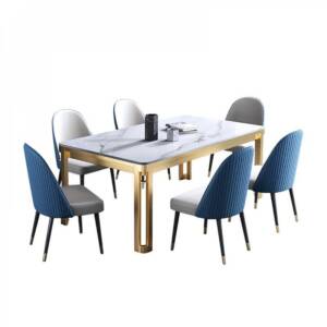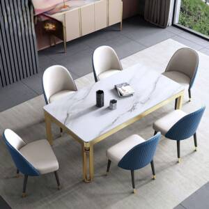طاولات سفرة بتصميم فاخر يجمع بين الفخامة والعملية بسطح رخامي متين وعالي الجودة يوفر لغرفة طعامك مظهرًا عصري وهي طاولات مصنوعة من المعدن ومطلي باللون الذهبي ما يضفي عليها لمسة فخمة ومتانة تدوم طويلًا، وتأتي الطاولة مع مجموعة من الكراسي المصممة بتنجيد فاخر الذي يجمع بين اللون الأبيض والأزرق مع أرجل معدنية أنيقة تعزز من الاستقرار والراحة هذه الطاولة مثالية لغرف الطعام العصرية وتوفر لك تجربة طعام فاخرة.