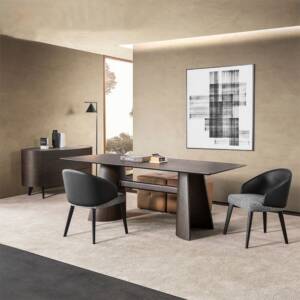طاولات طعام خشب مودرن بتصميم يجمع بين الحداثة والبساطة في آن واحد ما يجعلها خيار مثالي لغرف الطعام الحديثة، وتأتي الطاولة بسطح خشبي متين بلون داكن ليمنحها طابع راقي يناسب مختلف أنواع الديكورات وترتكز الطاولة على قواعد متينة بتصميم هندسي مميز يوفر ثبات وقوة تحمل عالية وأناقة لغرفة طعامك لتكتمل فخامة الطاولة خصوصًا مع الكراسي الحديثة ذات الإطار المعدني والمقاعد المبطنة بأجود أنواع الإسفنج لتجربة جلوس مريحة وتناسب أيضًا هذه الطاولة الاجتماعات العائلية والمناسبات الخاصة.