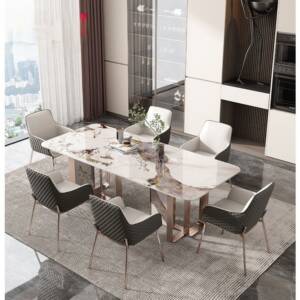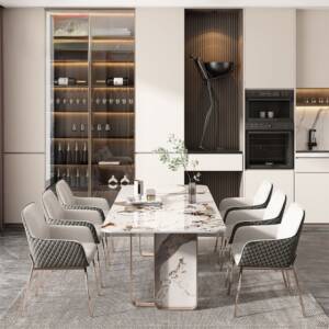 - طاولة طعام رخامية فاخرة تتميز بتصميم أنيق يجمع بين الرخام والستانلس ستيل مما يضفي لمسة عصرية مميزة إلى غرفة الطعام.