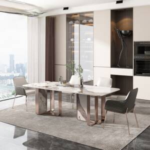 - طاولات طعام فخمة مصنوعة من أجود أنواع الرخام مع أرجل من الستانلس ستيل المقاوم للصدأ والتآكل والذي يضمن المتانة والإستدامة على مر السنين.