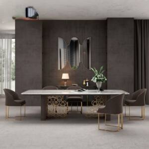 أنتقي طاولات طعام فخمة وأجعل غرفة طعامك تحفة فنية تجمع بين الفخامة والابتكار في آن واحد حيث تأتي بسطح رخامي أنيق يعكس الرقي والجودة العالية علي التصميم بينما تضفي القاعدة بتصميمها الهندسي العصري لمسة من التميز من مكانك للاثاث.
