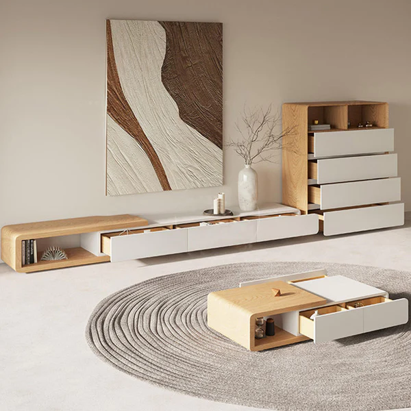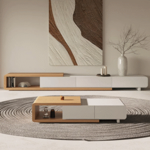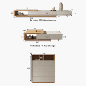 يتميز طقم الطاولات بسطح وعددة ادراج مع تصميم عصري وحديث . وتتميز بلمسة نهائية محايدة تنسق مع أي ديكور تقريبًا ، كما أنها مصنوعة من خشب الام دي اف والقاعدة الصلبة الخشبية لتكمل البنية القوية إلى جانب تصميم ممتع.