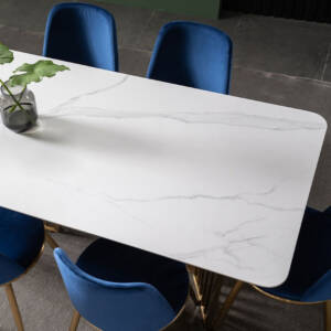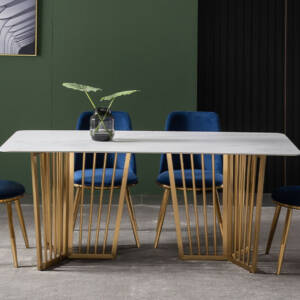 نقدم لكم طاولة طعام رخام ستيل المصممة بعناية فائقة لتكون إضافة فاخرة إلى مساحة تناول الطعام بسطح مصنوع من الرخام الأبيض وقاعدة معدنية باللون الذهبي تمزج بين الفخامة والرقي في تفاصيلها ويأتي معها مجموعة من الكراسي المريحة والعملية المتوفرة بألوان متعددة لتختار منها ما يناسب ديكور الغرفة لتخلق جوًا أنيقًا للعشاء العائلي وتجمعات الأصدقاء.