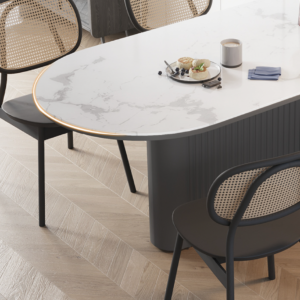 - طاولة طعام قابلة للطي تتميز بتصميم عصري مزود بديكور من الروطان يمنح غرفة طعامك لمسة فاخرة.