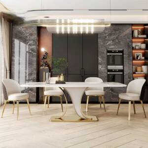 - سطح الطاولة مصنوع من رخام عالي الجودة مقاوم للخدوش والبقع وسهل التنظيف، كما أنه مقاوم لدرجات الحرارة العالية لتتمكن من الاستمتاع بطعامك الساخن دون قلق.