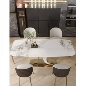 طاولة طعام رخامية فاخرة من متجر مكانك بتصميم ملكي باللون الأبيض المطعم بالذهبي مصنوعة بعناية فائقة لتلبية احتياجاتك اليومية وتدوم معك لسنين فالسطح مصنوع من أجود أنواع الرخام الذي يتميز بنقوشات فنية رائعة مع قاعدة من الستيل المتين بشكل انسيابي يخطف الأنظار مع كراسي عملية مريحة بألوان متعددة تناسب جميع الديكورات.