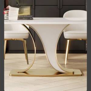 - لون الطاولة الأبيض يمنح المكان لمسة نقية ومشرقة مع إحساس بالراحة والاتساع في المكان كما أنها ة مطعمة بلمسات ذهبية لامعة تزيد من تألقها.