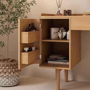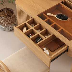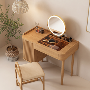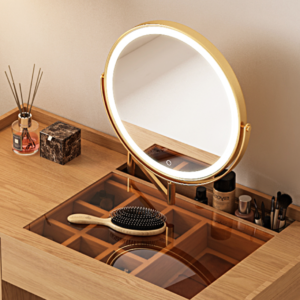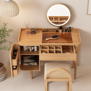 ارتقي إلى مستوى جديد من التنظيم والجمال مع طاولة مكياج خشبية مع مرآة مضيئة لتتمتعي بلمسة من غرف الأميرات، إن هذه الطاولة تمنحكِ درج لتنظمي أغراضك بكفاءة عالية وتأتي الطاولة بتصميم عصري يجمع بين البساطة والفخامة، كما أن الطاولة تناسب جميع أنماط الديكور بفضل لونها الخشبي الدافئ، ويتيح لكِ السطح الأملس للطاولة مساحة واسعة لترتيب مستحضرات التجميل والعناية بالبشرة.