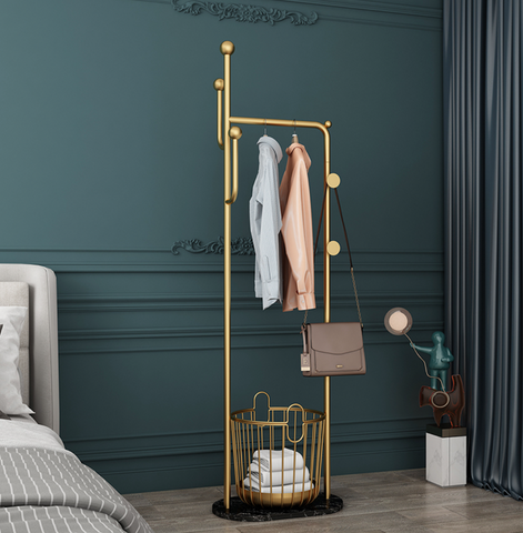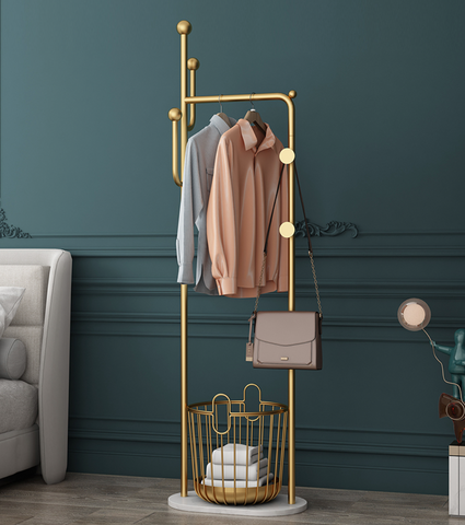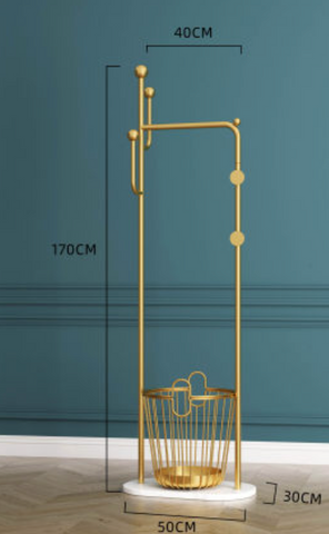 التصميم والمواد: تأتي علاقة الملابس مع سلة بتصميم استثنائي، حيث تتكامل مواد فاخرة لتجلب لك تجربة فريدة. الخطوط الناعمة والتفاصيل الدقيقة تظهر بوضوح في هذه القطعة الرائعة. تم تصنيعها من الستيل المذهب الصلب الذي يمنحها المتانة والقوة، بالإضافة إلى قاعدة رخامية لامعة تضفي لمسة من الفخامة.