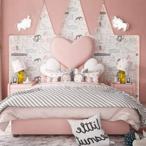 دلل أطفالك وجهز أشيك غرفة نوم اطفال بنات من مكانك مع سرير اطفال بتصميم لطيف الظهر على شكل قلوب ملونة تضفي لمسة جمالية إلى التصميم، آمن ومناسب للصغار مصنوع من الخشب المتين ومغطى بالجلد الفاخر الذي يمنحه أناقة لا تضاهى.