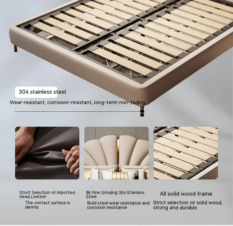 التنجيد الجلدي يمنح السرير طابعًا أنيقًا ويخدمك في التنظيف السريع؛ عادة يكفي مسح لطيف للحفاظ على الشكل العام. كما أن السطح الجلدي ينسجم مع أغلب ديكورات غرف النوم، من الهادئ إلى العصري.