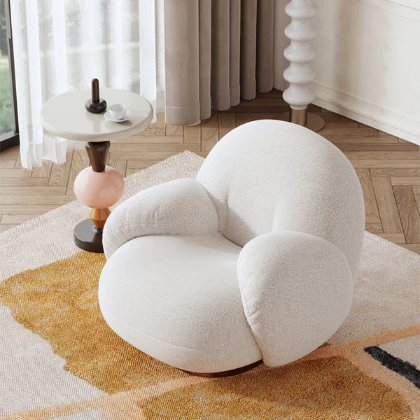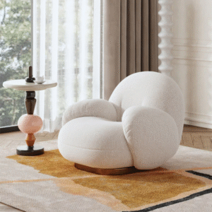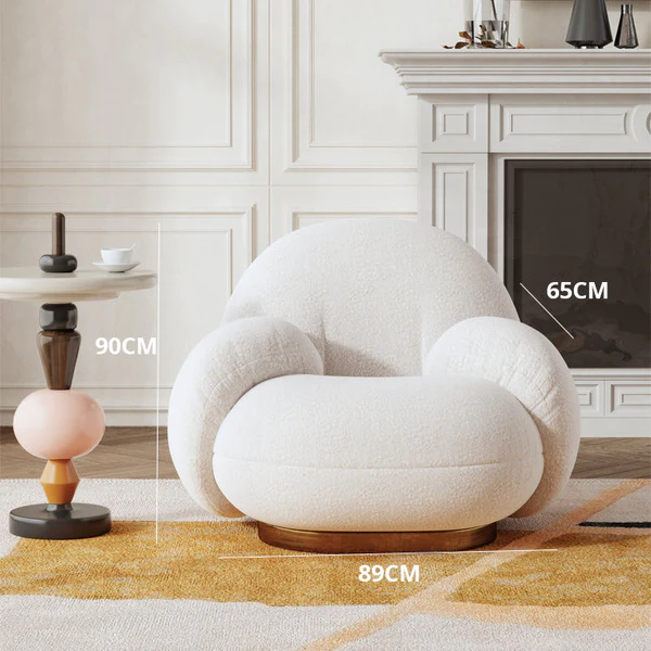 يتميز كرسي الاسترخاء بتصميم فخم ومريح . ويتميز بلمسة نهائية محايدة تنسق مع أي ديكور تقريبًا ، كما أنه مصنوع من قماش البوكلية وخشب متين عالي الجودة والقاعدة الصلبة الخشبية لتكمل البنية القوية إلى جانب تصميم ممتع.