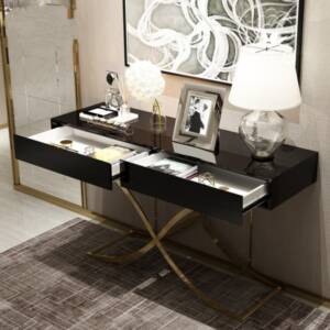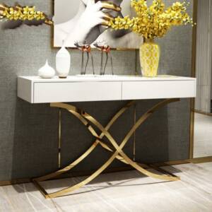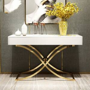 كونسول ذهبي القاعدة مصنوع من الاستانلس ستيل عالي الجودة ومقاوم للصدأ والتآكل، مصممة بطراز عصري أنيق وتحتوي على أدراج لتمنحك مساحة تخزين إضافية.