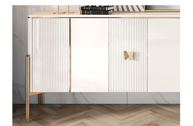 بوفية مصنوع من خشب زان فاخر قوي متين عالي الجودة مع أجزاء معدنية في القواعد والمقابض. هذا المزج يعطي شكلًا متناسقًا ويجعل البوفيه مناسبًا للاستخدام اليومي في أكثر من مكان داخل المنزل. للعناية، يكفي مسحه بقطعة قماش ناعمة وجافة أو مبللة قليلًا حسب الحاجة، مع تجنب ترك السوائل على السطح لفترة طويلة.