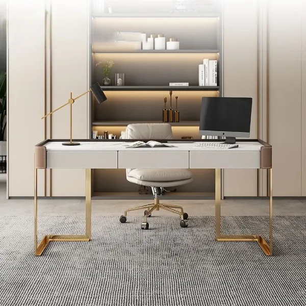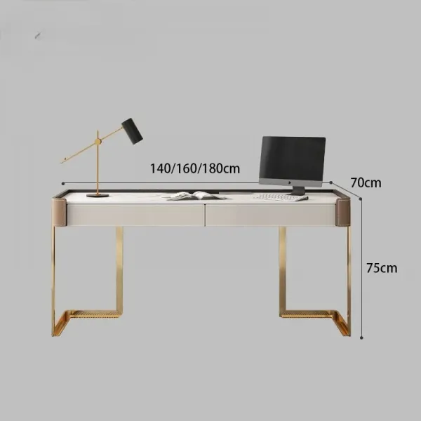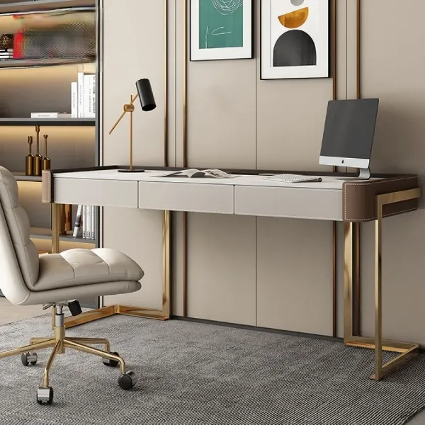 تمت إضافة لمسات من الجلد عالي الجودة على الأطراف لتعزيز الفخامة وإبراز التفاصيل الجمالية للتصميم، مما يجعل المكتب قطعة مميزة تضيف طابعًا راقيًا لأي مساحة. يتوفر المكتب بعدة مقاسات لتناسب مختلف الاحتياجات والمساحات، مع خامات مختارة بعناية تجمع بين المتانة والمظهر العصري.