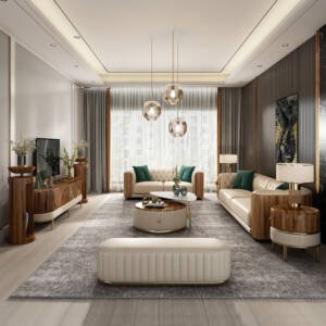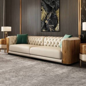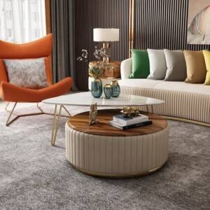 الخامات الرئيسية : مصنوعة من الخشب الهندسي المتين مغطي بطبقة من الجلد الايطالي الناعم الرائع ومبطن بالاسفنج عالي الكثافة والمرونة . والطاولات مصنعة من الخشب الصلب مع القاعدة الستيلية المذهبة الصلبة والمتنية ذات اللمسة العصرية والفاخرة مع سطخ الرخام اللامع والمقاوم للصدمات