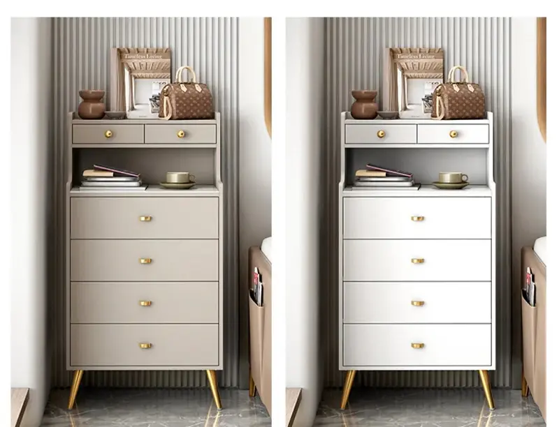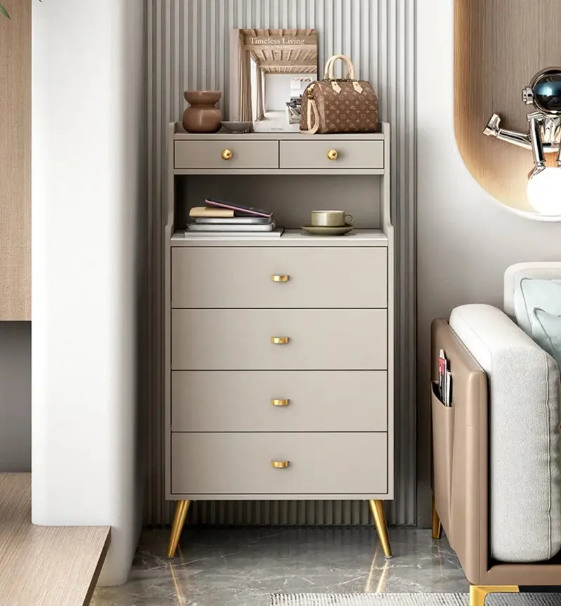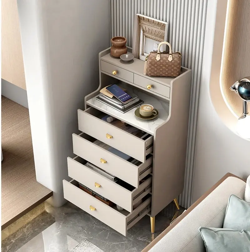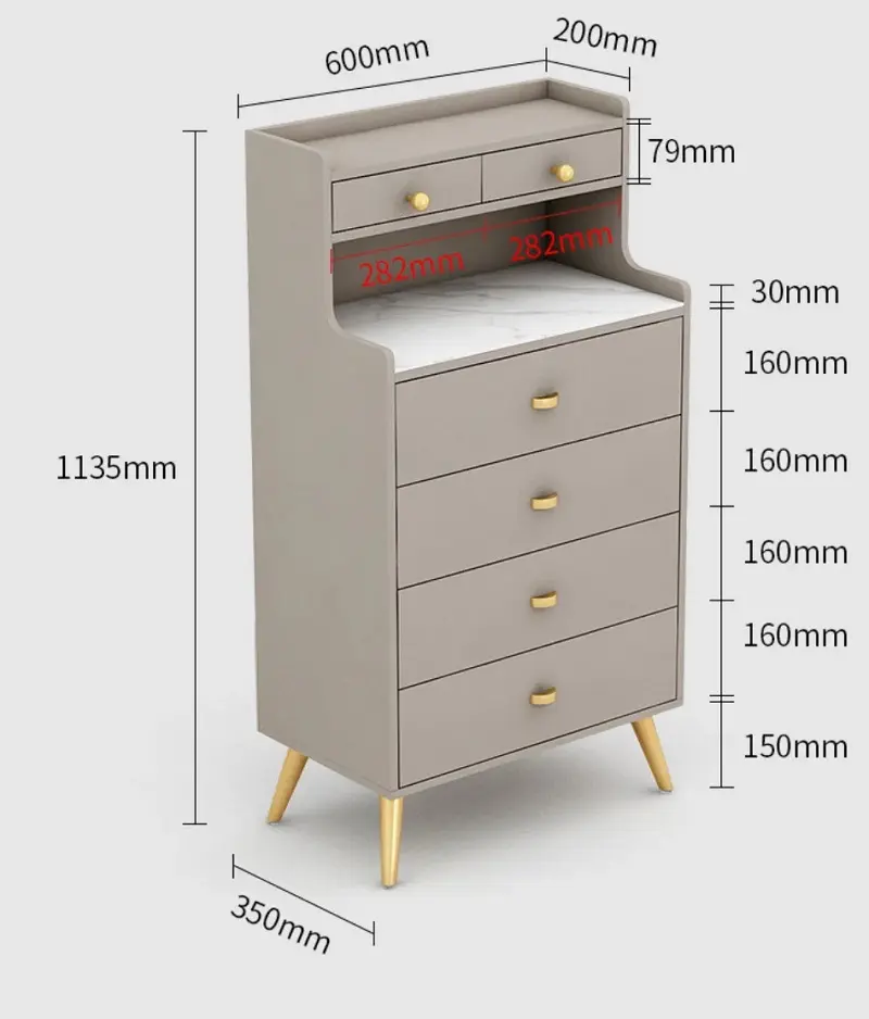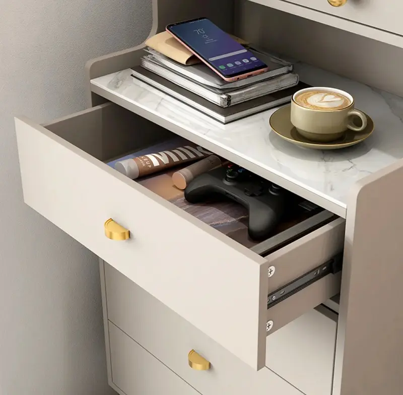 خزانة أدراج هيكل الخزانة مصنوع من خشب هندسي فاخر عالي الجودة وخشب زان روماني متين عالي الجودة بملمس جميل، مع قاعدة معدنية وأرجل معدنية تمنح ثباتًا أفضل. السطح مصمم ليكون عمليًا في العناية مقاوم للخدش، ومقاوم لدرجات الحرارة العالية، وسهل التنظيف وهذه مزايا تهمك إذا كانت الخزانة في مساحة حيوية داخل المنزل.
