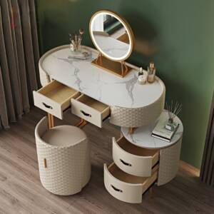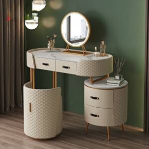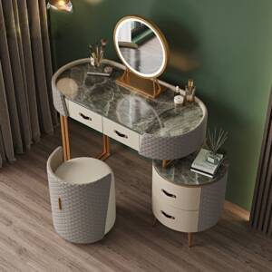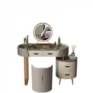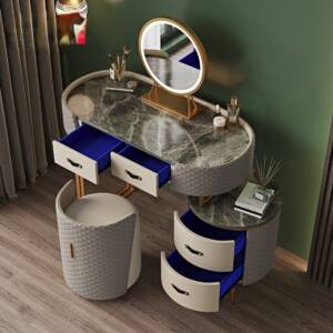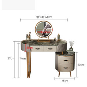تخيل أن تبدأ صباحك أمام تسريحة نوم تجمع بين الفخامة العملية والجمال الأخاذ فهي لوحة ديكور حية تعكس ذوقك الرفيع، سطحها مصنوع من رخام فاخر يمنحك إحساس الفخامة من أول لمسة، بينما يجتمع اللونان الرمادي والذهبي بتناغم يضفي لمسة ملكية على غرفتك، كما أن تصميمها العصري الممزوج بالتفاصيل الكلاسيكية يمنحك إحساس الراحة والأناقة في آن واحد.