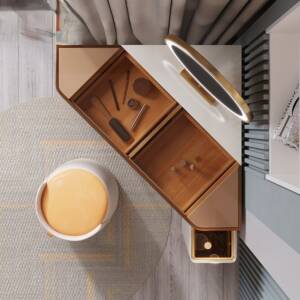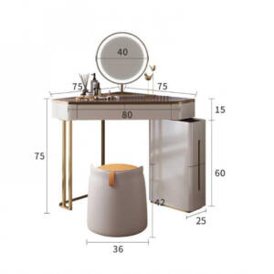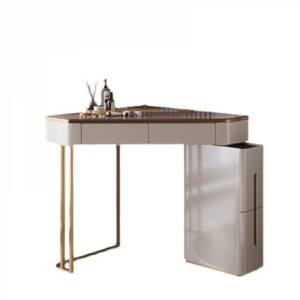 طاولة تسريحة زاوية تناسب المساحات المحدودة وتوفر لك خيارات متعددة من الاستخدامات لأنها تحتوي على أدراج تخزين مع خزانة جانبية طويلة لتخزين القطع الأكبر سواء من أدواتك الشخصية أو منتجات العناية بكل سهولة مع كرسي مميز ومريح منجد جلد.