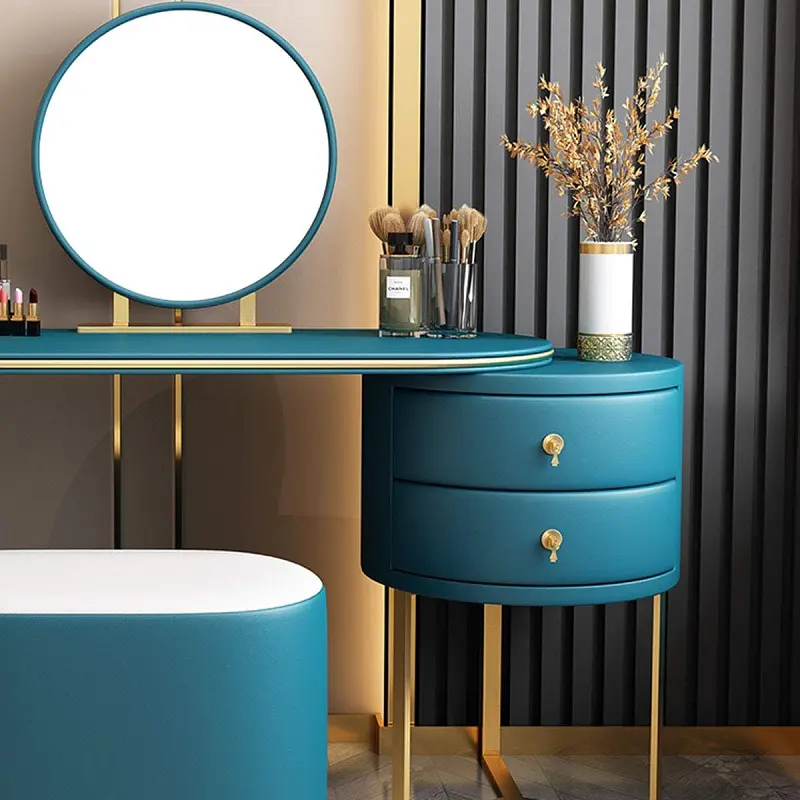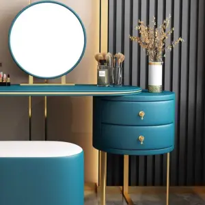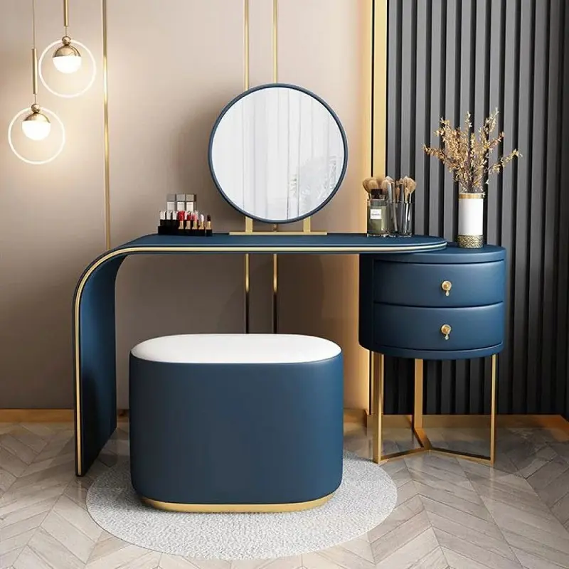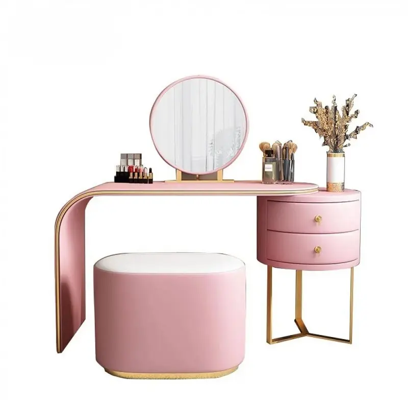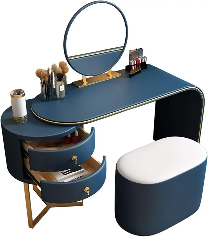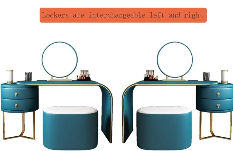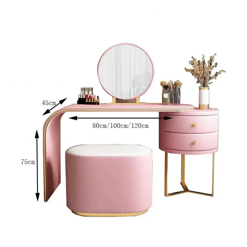 هذا طقم تسريحة مع مرآة وكرسي مصمم ليكون جزءًا جميلًا وعمليًا من روتينك اليومي. السطح المنحني يعطيه حضورًا ناعمًا وراقيًا، ومع الأدراج الجانبية الدائرية تحصلين على شكل مختلف عن التصاميم التقليدية، وفي نفس الوقت مساحة مرتبة للأشياء التي تحتاجينها دائمًا مثل الإكسسوارات والعطور وأدوات العناية.