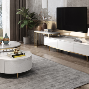 طاولات تلفزيون خشبي يجمع بين الفخامة الكلاسيكية السعودية واللمسة المودرن بتصميم متكامل وذكي تتكون المجموعة من طاولة رئيسية مرتفعة بسطح رخامي وقاعدة معدنية مجوفة تسمح بدمج طاولة خشبية أصغر أسفلها مزودة بأدراج تخزين عملية ويكمل المجموعة طاولة تلفزيون باللون الخشبي البني بتصميم أنيق مدمج بداخلها طاولة مستطيلة أنيقة ما يمنحك مظهر موحد وعملية تجمع بين الأناقة والتنظيم وتوفير المساحة في غرفة معيشتك.