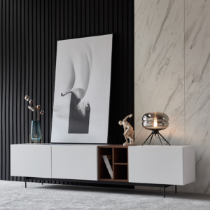 - اللون الأبيض لطاولة التلفاز يتماشى بشكل مثالي مع اللون البني في طاولات القهوة و يضفيان لمسة مريحة وعصرية على المكان.