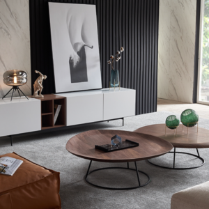 طقم طاولة تلفاز وطاولتين قهوة مصمم على الطراز الإيطالي الحديث لمظهر متناسق بلون أبيض مطعم بالبني يتماشى مع لون طاولات القهوة ويضفي لمسة دافئة وراقية على المكان، الطقم مصنوع من أجود خامات الأخشاب مع قاعدة معدنية صلبة.