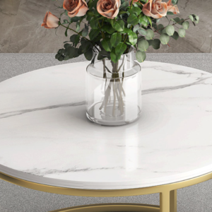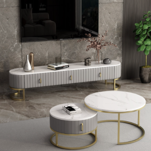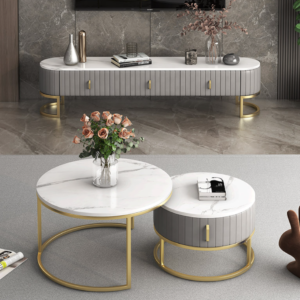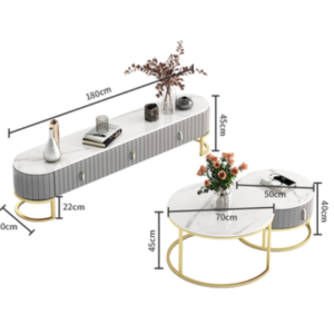 الخامات الرئيسية : طاولة التلفاز مصنوعة من الخشب الهندسي المتين مع قاعدة من الستيل المذهب الصلب وطاولة القهوة مصنة من اجود انواع الستيل المذهب مع السطح الرخامي اللامع