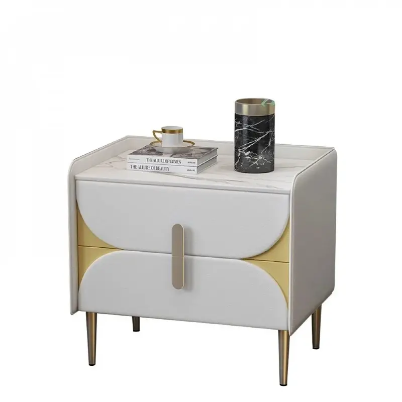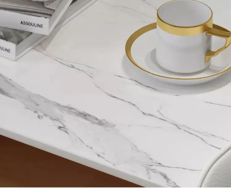 الخامة الأساسية من خشب متين، مع تغطية من الجلد الإيطالي الفاخر تمنح ملمسًا راقيًا وسهولة في العناية. السطح الرخامي يضيف لمسة فخامة واضحة، بينما القواعد المرتفعة تمنح الطاولة ثباتًا وشكلًا مرتبًا. الأرجل معدنية لتدعم الاستخدام اليومي وتساعد على ثبات القطعة.