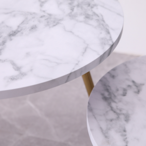 طاوله جانبيه تصميم Dario بقاعدة مصنوعة من المعدن , وتتميز بلمسة ذهبية لإضفاء لمعان بريق في غرفة المعيشة . سطح الطاولة الدائري مصنوع من الخشب ويتميز بلون مستوحى من الرخام الرائع