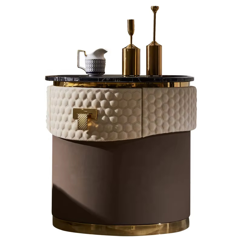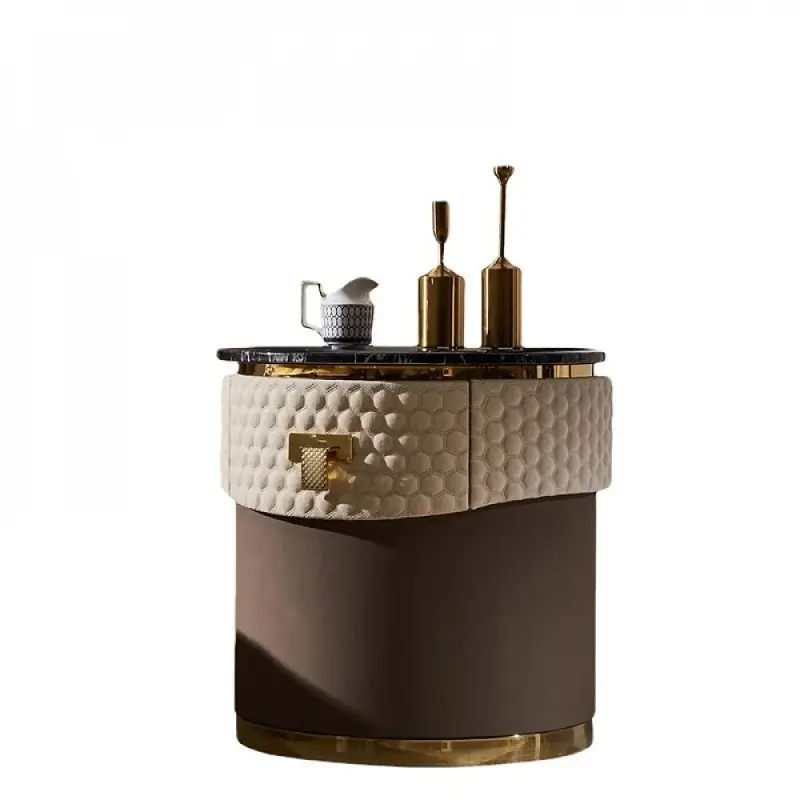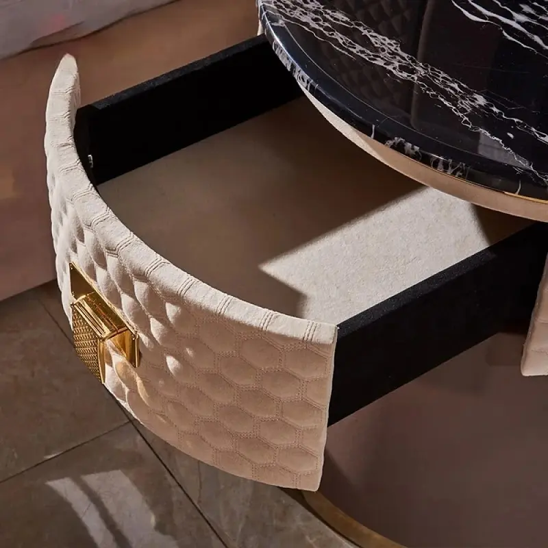 هذه الطاولة الجانبية بتصميم دائري مميز، مناسبة لتكون بجانب الكنبة أو السرير أو في زاوية الاستقبال. سطحها الرخامي يمنحها حضورًا فخمًا، بينما يضيف شكلها الدائري سلاسة على حركة المكان ويقلل الزوايا الحادة، وهذا يجعلها خيارًا مريحًا للبيت اليومي.
