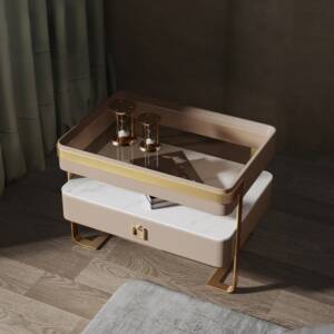 تتميز طاولتنا الجانبية بتصميم مودرن فريد يجمع بين الأناقة والعملية، مما يجعلها الخيار المثالي لكل منزل. صُممت هذه الطاولة لتكون إضافة رائعة لأي غرفة، سواء كانت في غرفة المعيشة أو غرفة النوم.